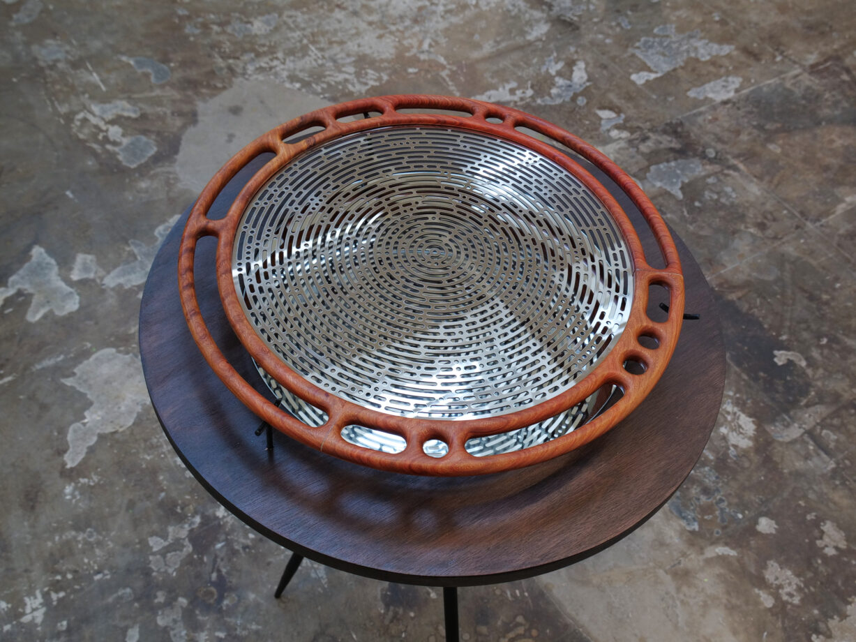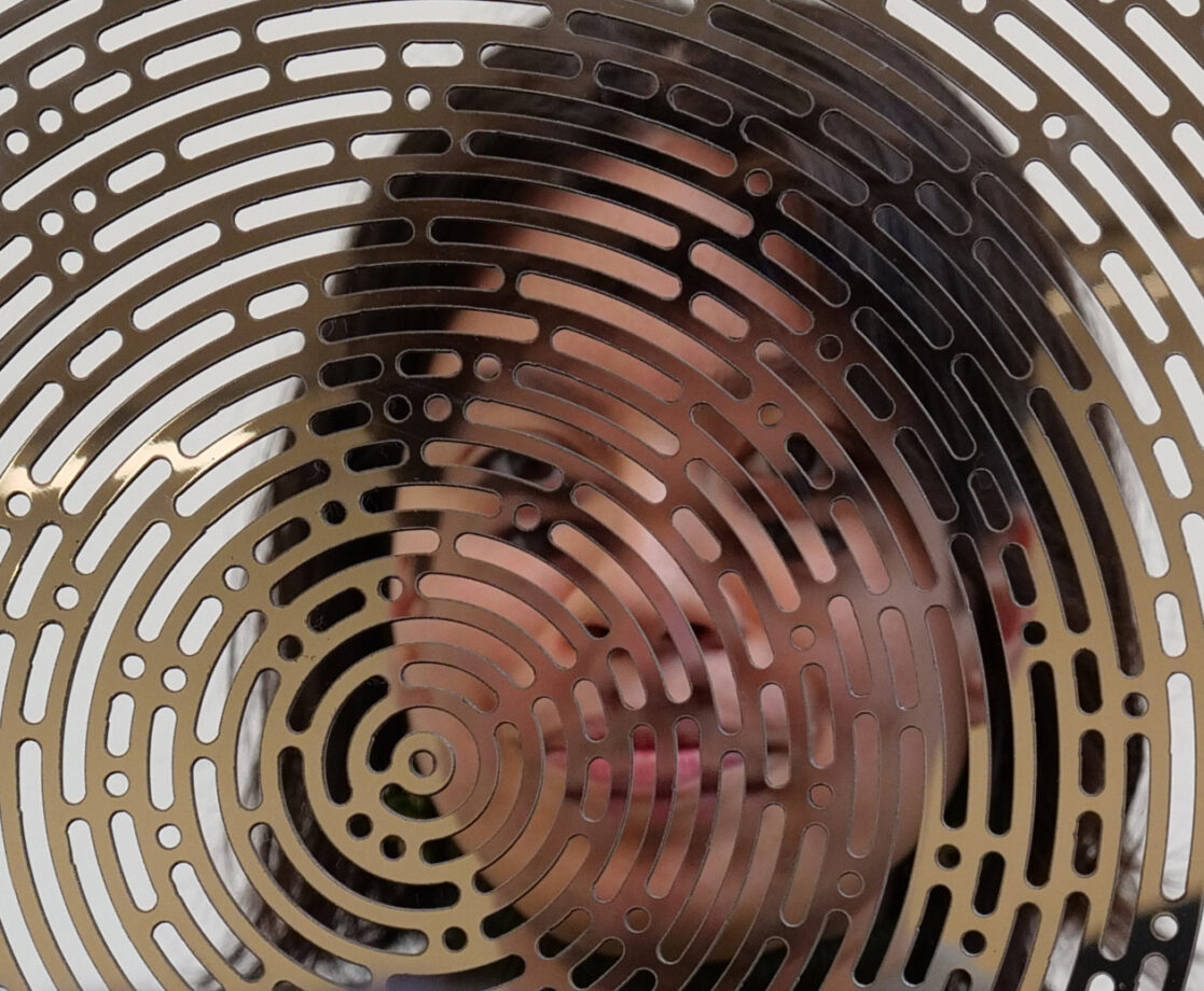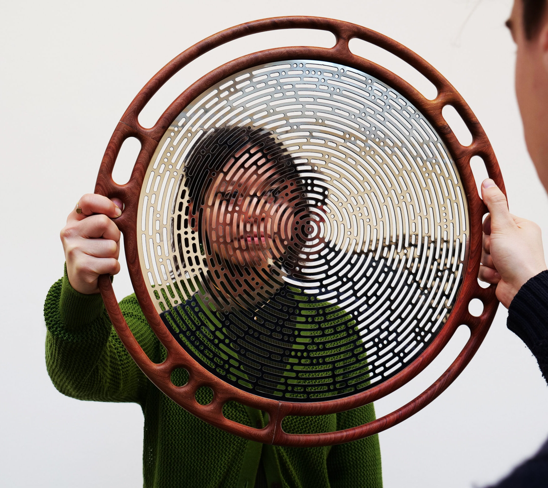 Quantum Mirror allows the concept of quantum state to be experienced through the gaze of two observers. A double-sided mirror, from which an algorithmic pattern is cut out, is held simultaneously by two persons opposite to each other. While one sees 50% of their own reflection, the other 50% are the direct image of the other one’s face. The uncanny image produced of the two persons merged into one, echoes the concept of superposition from quantum mechanics.