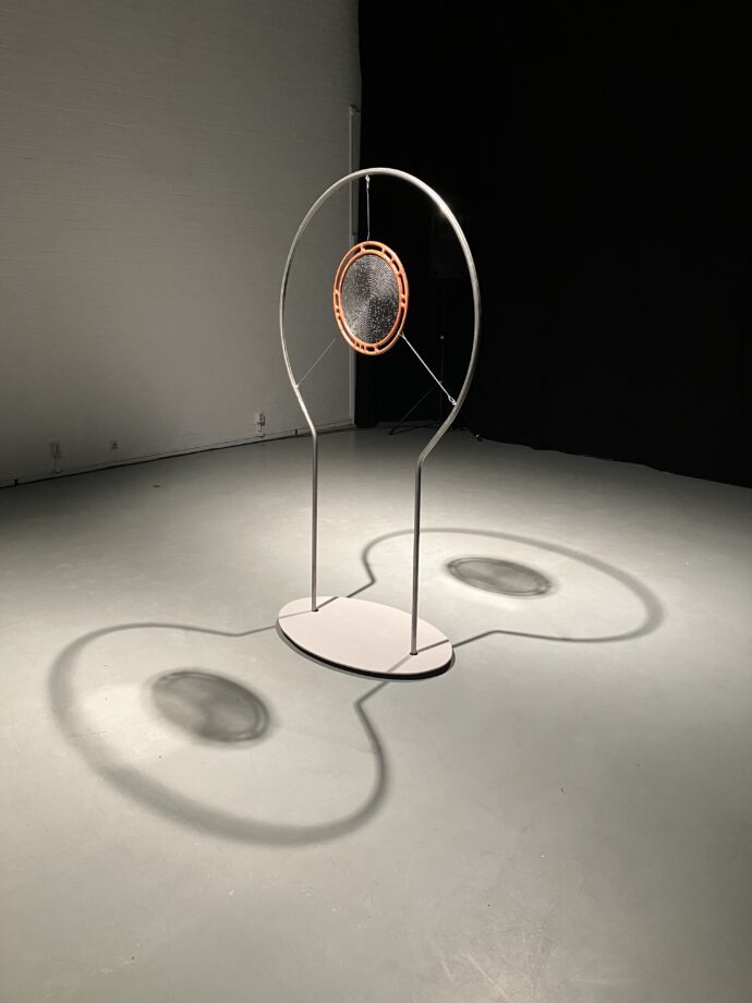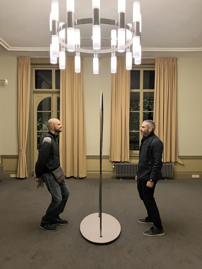 The two persons facing each other through their physiological stereoscopic apparatus, the eyes, search and alternate in parallax – the change in position of the reflected image relative to the background. Metaphorically, this image merging could be regarded as a re-construction rather than the collapse of the superposition. The blending of two faces into one also reminds us of the digital equivalents known as a ‘face-swap’. Due to its physicality and tangibility, Quantum Mirror evokes an alienating as well as an oddly intimate experience. Between seeing through and reflection, the two faces merge with instability, as any micro movement affects the image formed.